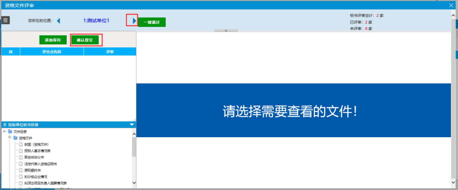 ,可对投标企业进行切换查看,等待所有投标文件评审完后,点击确认提交。