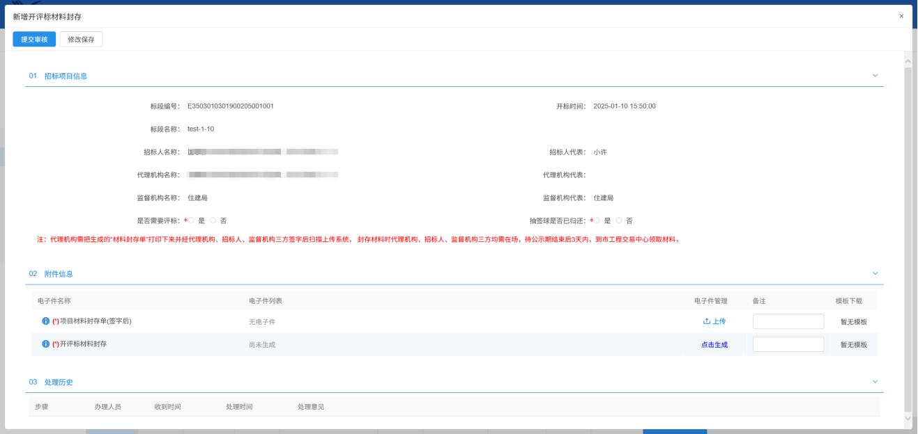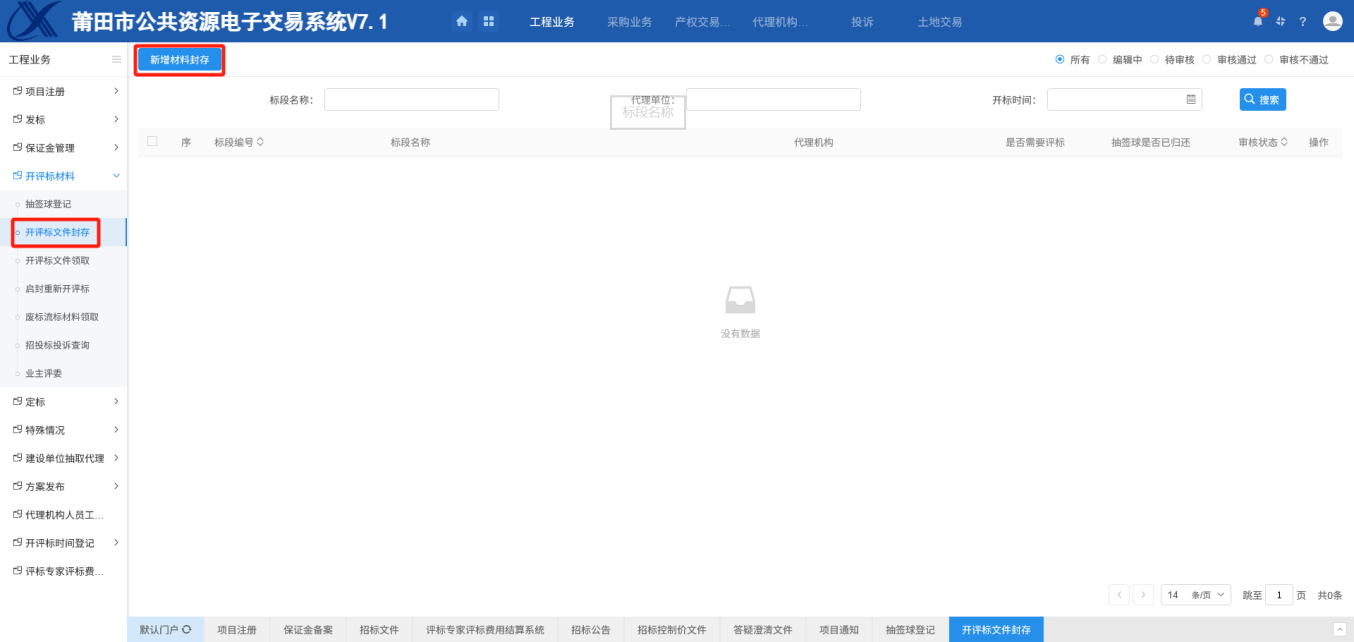 流程功能:该标段开评标材料要先封存,填写中标内容,