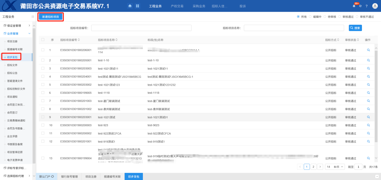 项目注册/报建编号关联、初步发包、场地预约、保证金备案、招标文件、招标公告、招标公告发布