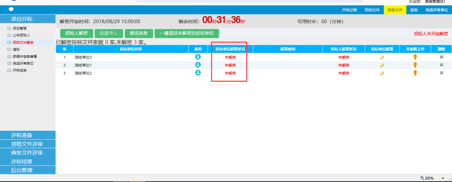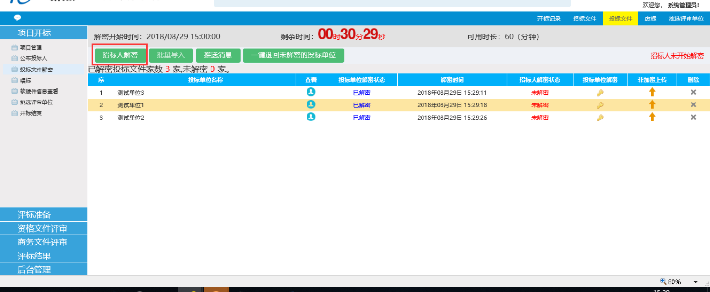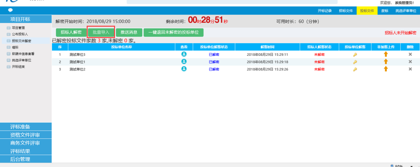 2、 等待所有投标人解密完毕后,点击招标人解密,完成后再点导入批量导入,进行投标文件的导入。