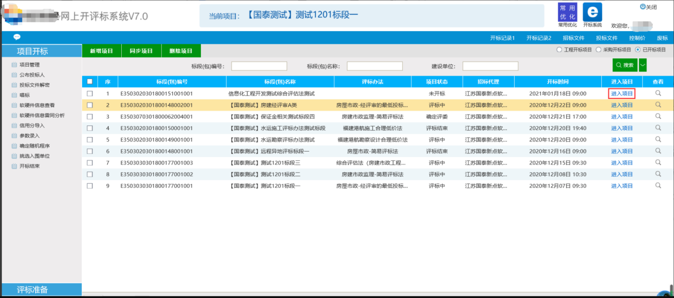 用专家账号密码登录开评标系统,选择项目进入