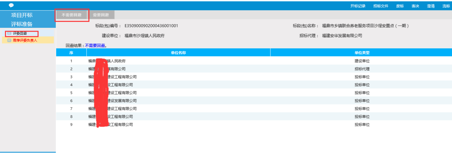 1、选择评委回避菜单,确认单位后,点击不需要回避进入下一步。