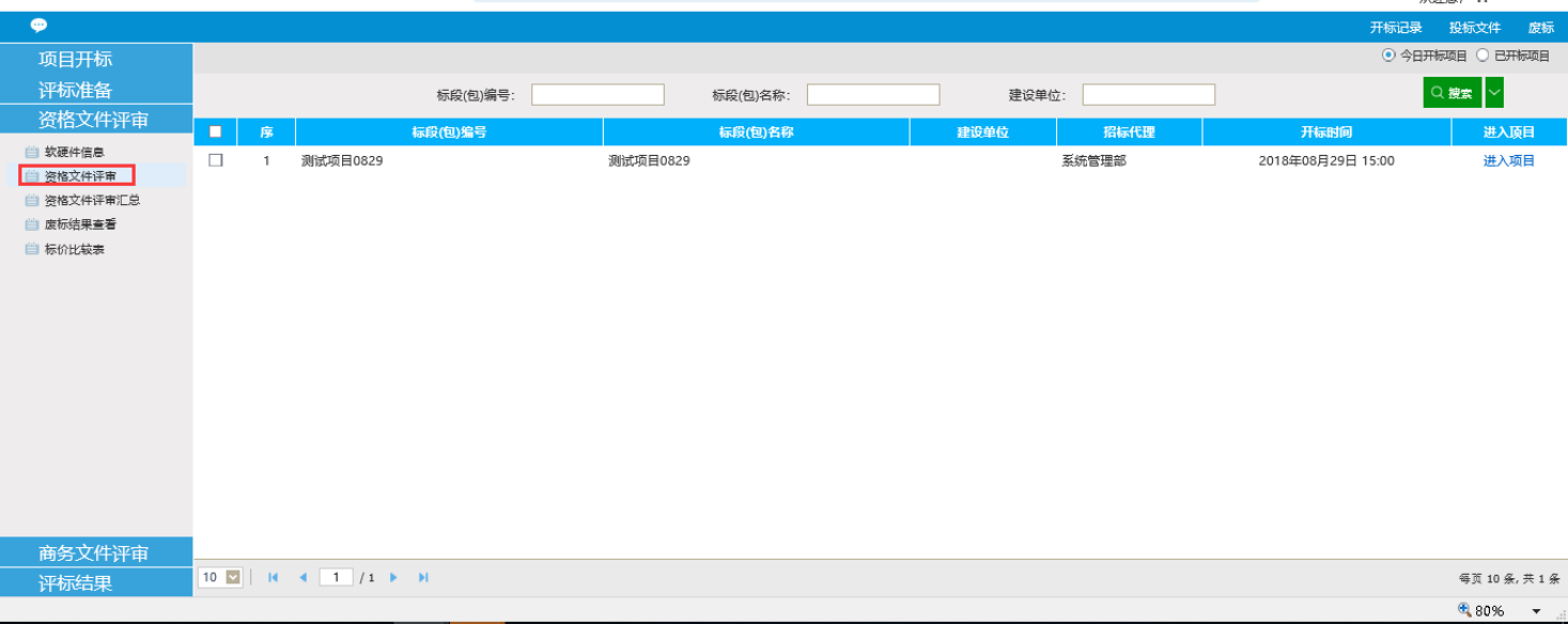 1、选择初步评审——资格评审,可对投标单位进行资格文件评审,如下图
