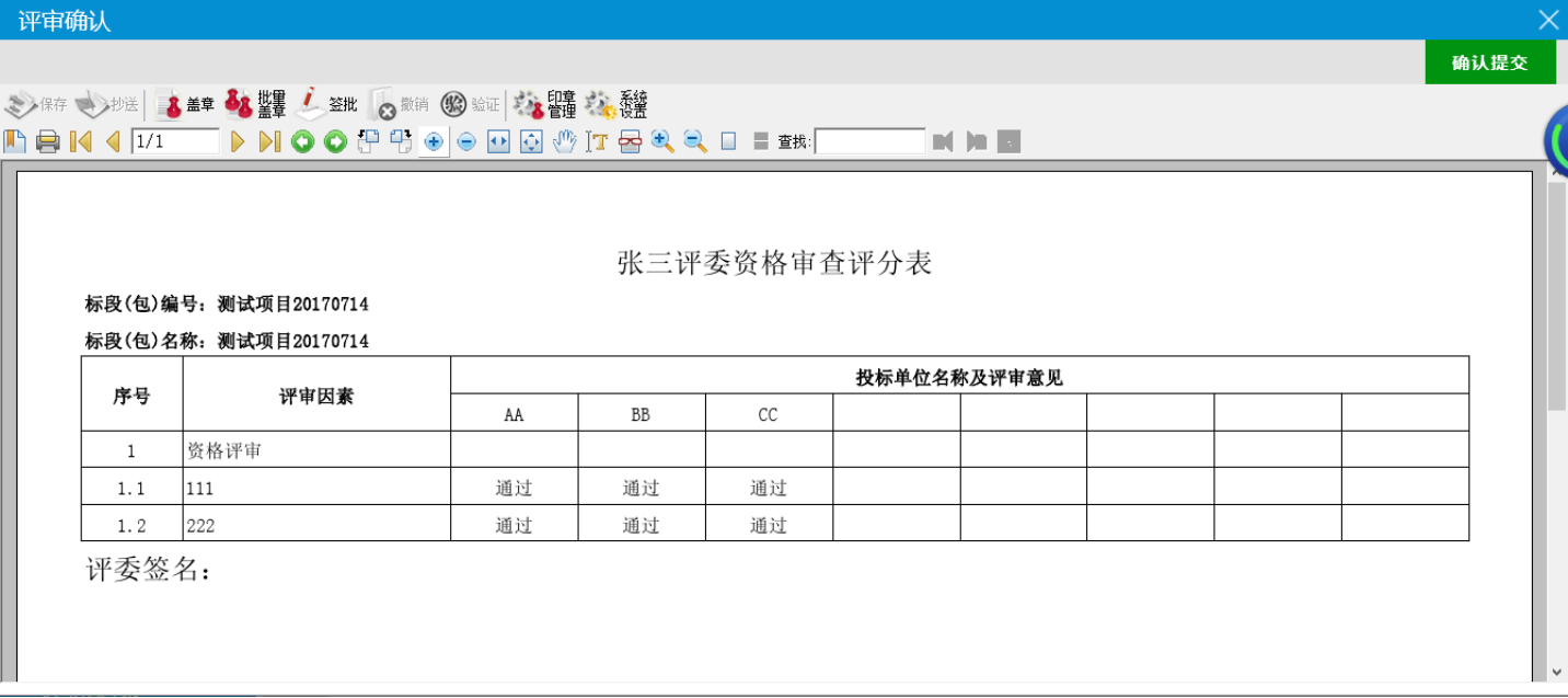 4、页面生成评委资格审查评分表,确认无误后点击右上方的确认提交。