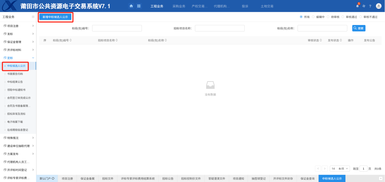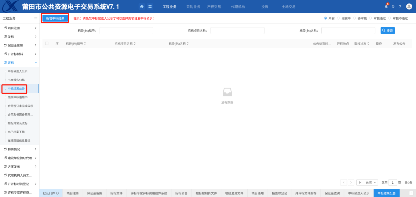前提条件:评标结束,产生了中标单位,已发布中标候选人公示;