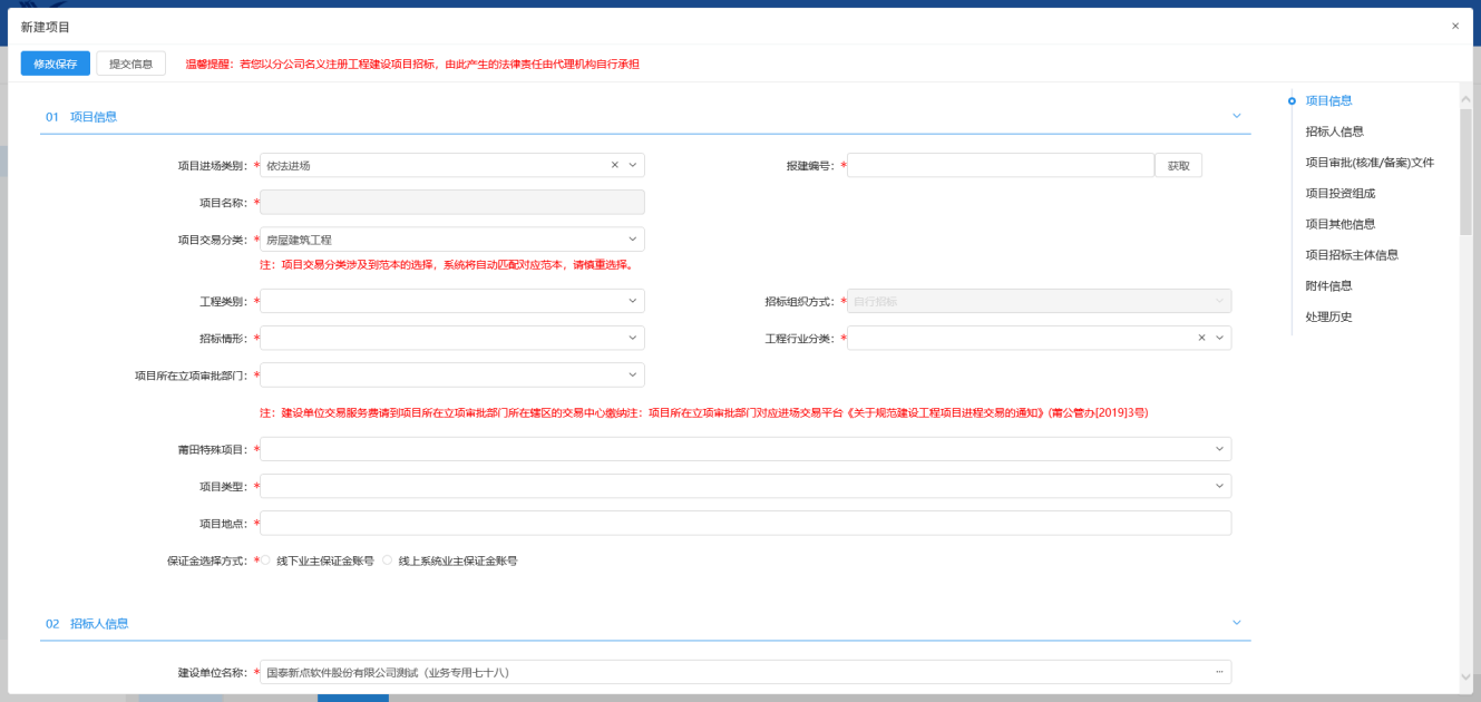 ,如下图,选择“项目交易分类”、“项目所在管理部门”,填写其他信息。