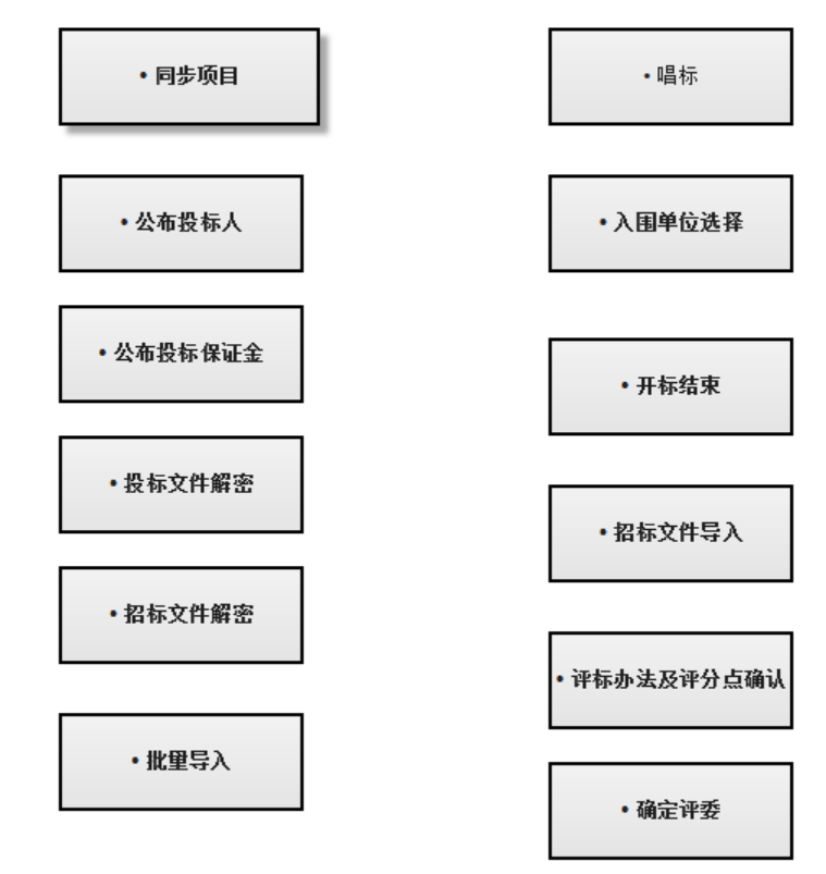 流程功能: 1.CA登录开标管理员 2.同步项目并进入项目 3.公布投标人名单 4.公布投标人保证金(代理端登录申请银行查询) 5.入围名单,进行投标人解密(投标人无须到现场直接网上CA解密投标文件) 6.招标人解密 7.唱标 8.工程项目(评标之前设置公式详情见对应范本 9.导入招标文件 10.抽专家 11.评标系统创建专家 12.代理评标结束打印评标报告13.评标结束