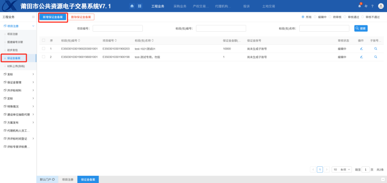 1.进入页面“保证金备案”,点击“新增保证金备案”,进入操作界面如下图: