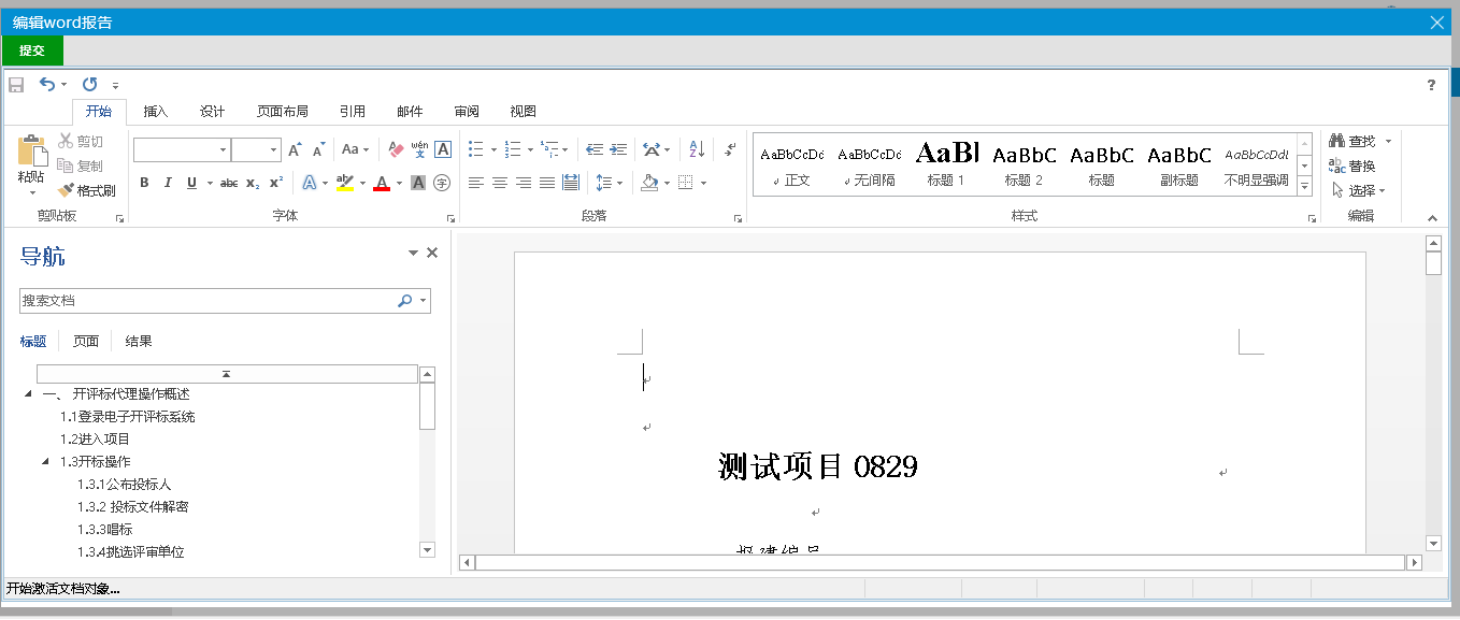 1、对评标报告进行编辑,编辑完后点击提交。